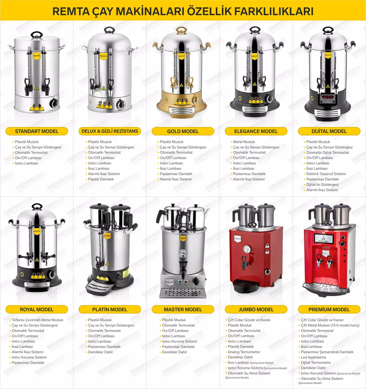 Remta 4 Demlikli Jumbo Çay Makinesi Şamandıralı 46 lt - Demlikler Dahildir.Özel tasarımı ve rengi ile, ofis ve iş yerlerinde kullanıma uygun olarak üretilen, remta jumbo model elektrikli çay kazanı 23+23 (46) litre çay kapasitesine sahiptir ve üzerine dört adet demlik konulacak şekilde üretilmiş olup demlikler ürün koli içeriğine dahildir. Cihazın iç ve dış kazan arası ısı yalıtımlı olup soğumayı geciktirerek elektrik tasarrufu sağlar. Üzerinde bulunan şamandıra sayesinde otomatik olarak tesisattan eksilen suyu tamamlama özelliğine sahiptir.