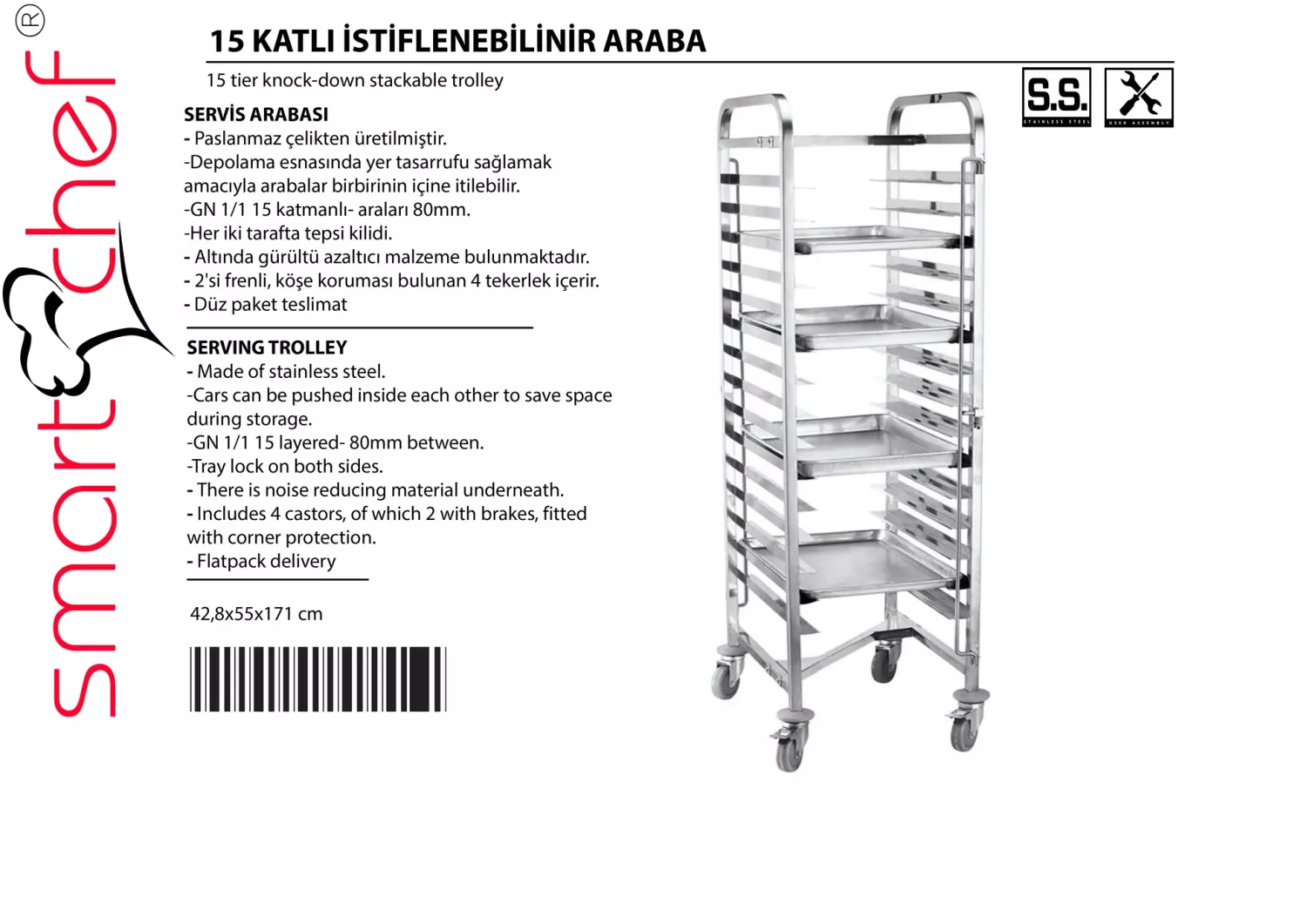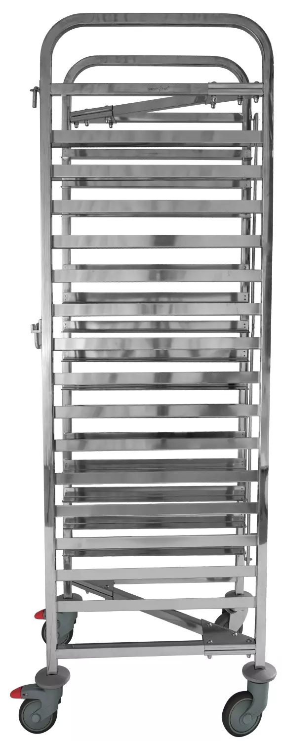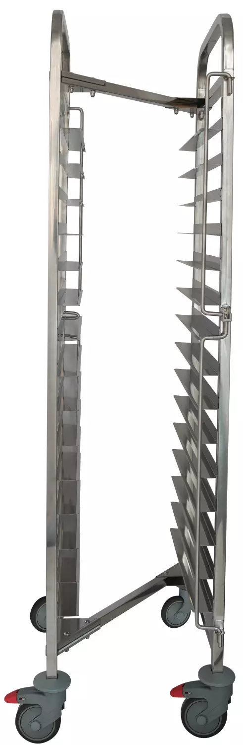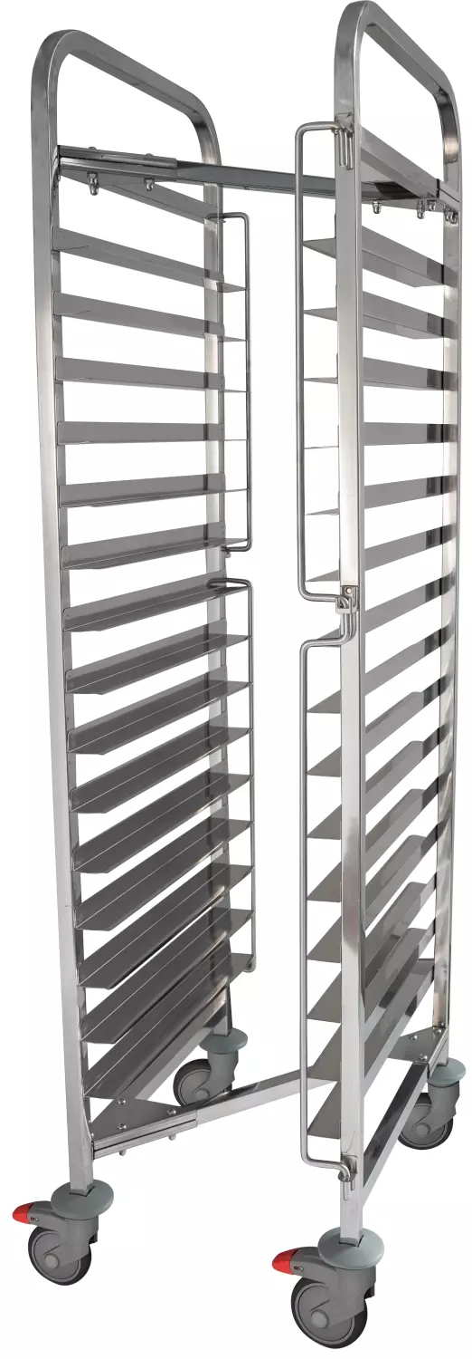 Paslanmaz çelikten üretilen gövdesi, uzun ömürlü ve hijyenik kullanım sunar. GN 1/1 ölçülerine uygun 15 katlı yapısıyla 80 mm tepsi aralığına sahiptir. Her iki yanda bulunan tepsi kilitleri sayesinde taşıma sırasında güvenli kullanım sağlar.